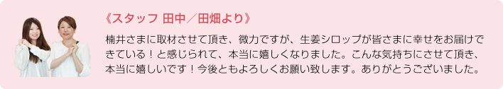 S:はい、凄く役立っています(笑)。生姜シロップが私の元気を支えてくれていると思っています。女性として冷えなどの悩みをキッカケに飲み始めましたが、その悩みも最近は、感じませんし、加えてやはり「元気」になった!気がしています!!