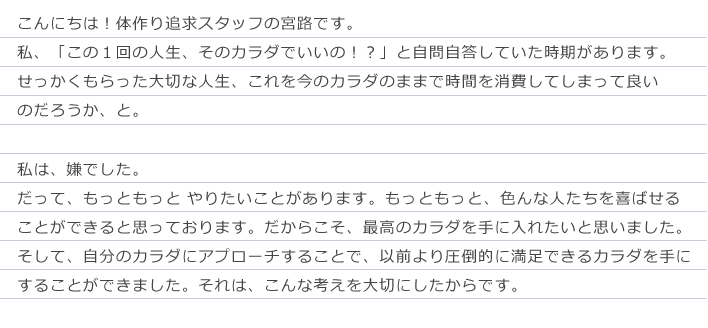 ナイスなカラダは、依存しない気持ち、そして「食」を大切にすることで手に入ると考えています!基本的なことですが、この「気持ち」に なることは、実は現代では凄く難しいことになっているのです。。