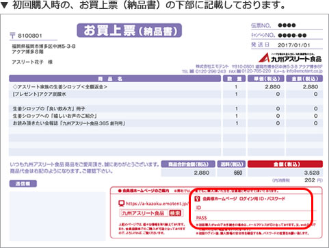 IDとパスワードは、商品と一緒にお送りさせて頂く お買上票(納品書)に、記載させて頂いております