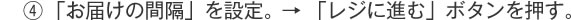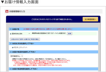 画面の表示に従い、今回のご注文のお届け先、支払い方法、 お届け日時などをお決め下さい。この時、お選び頂いたお日にち、お時間が 次回以降のお届け予定日時となります。