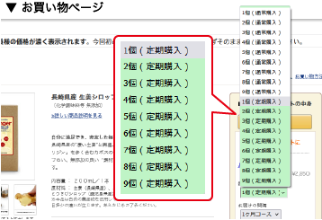 ショッピングカートに商品が入ると、数量を選択するプルダウンメニューが出てきます。そこで数量をお選び下さい。