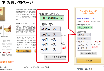次に、「お届けの間隔(何ヶ月おきにお届けするか)」 を設定します。お届け間隔は、 1ヵ月毎 、 2ヶ月毎 (商品により3ヶ月、4ヶ月毎)までご用意しております。プルダウンより、ご希望のコースをお選び下さい。