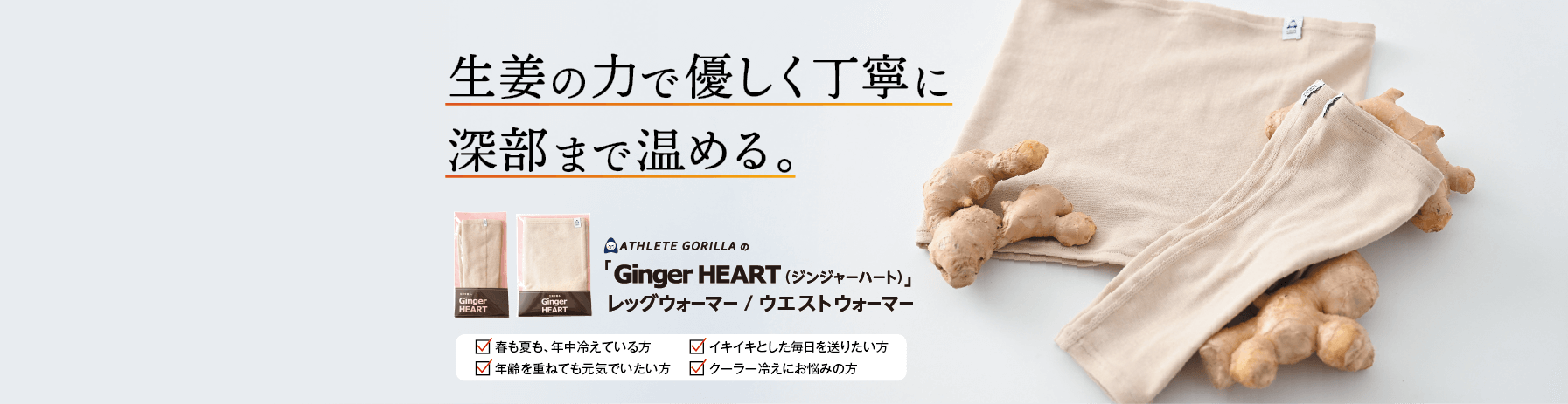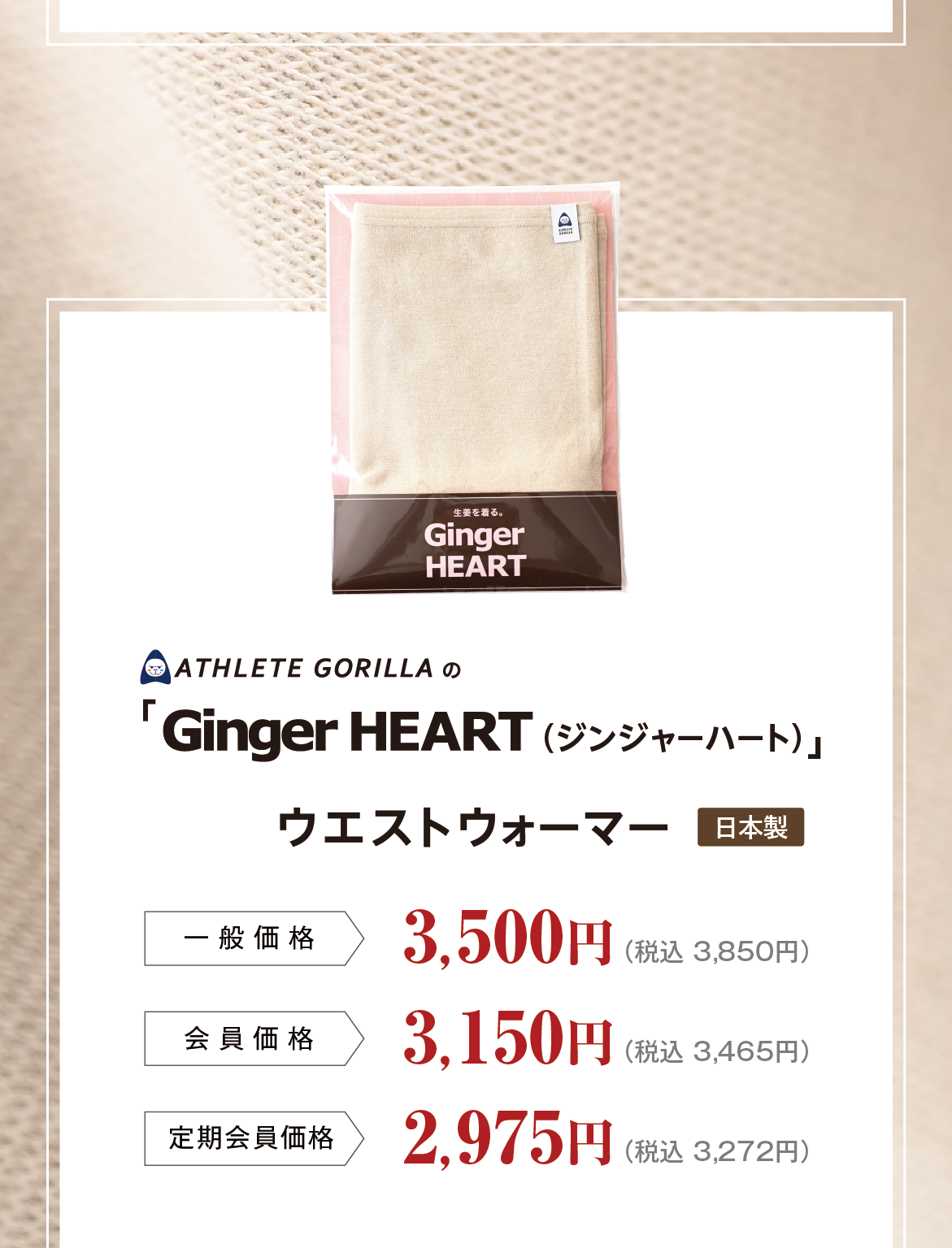 「ATHLETE GORILLA」と書かれた ブランドネームタグが、上部外側にくるようご着用くださいませ。ウエストウォーマーは、肌着などのインナーの上から着ていただくのがおすすめです。