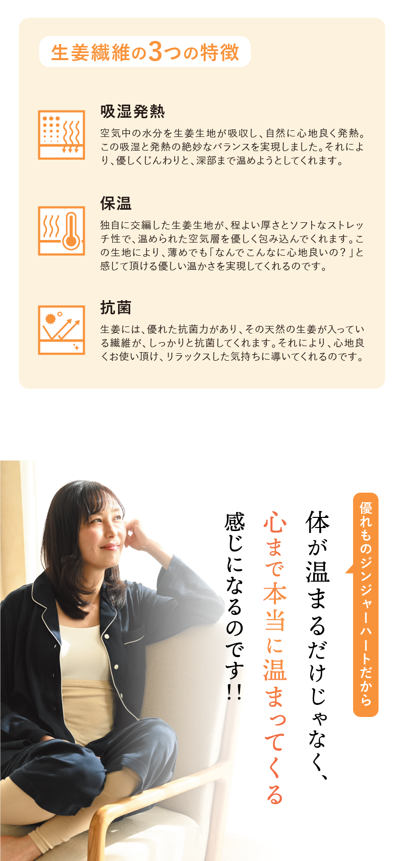年齢、ご状況問わずに、ご活用頂きたいですが、とにかく冷えにお困りの方、睡眠の質を大切にしている方、ストレスフルな環境で 体に負担をかけている方、自分に合ったリラックスウェアをお探しの方には、特にオススメです。