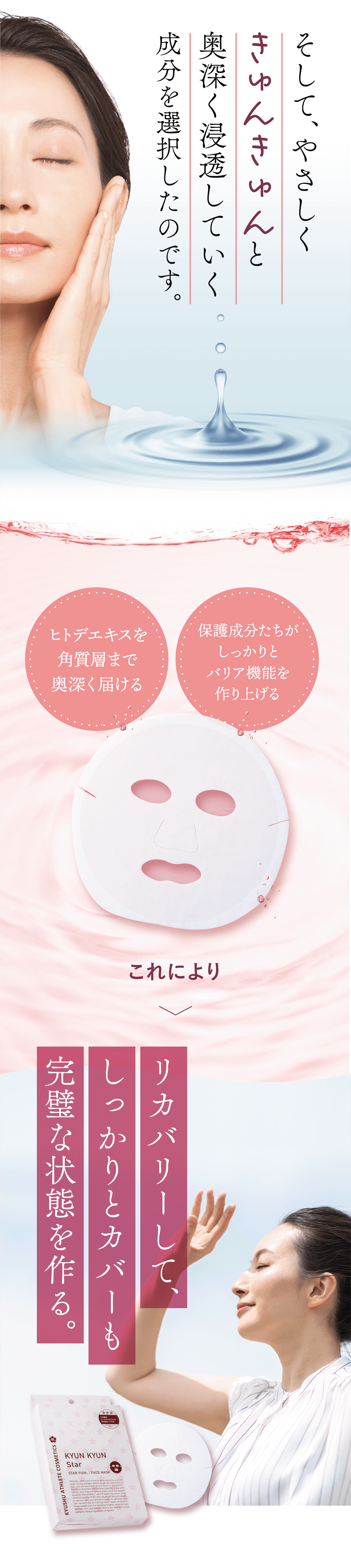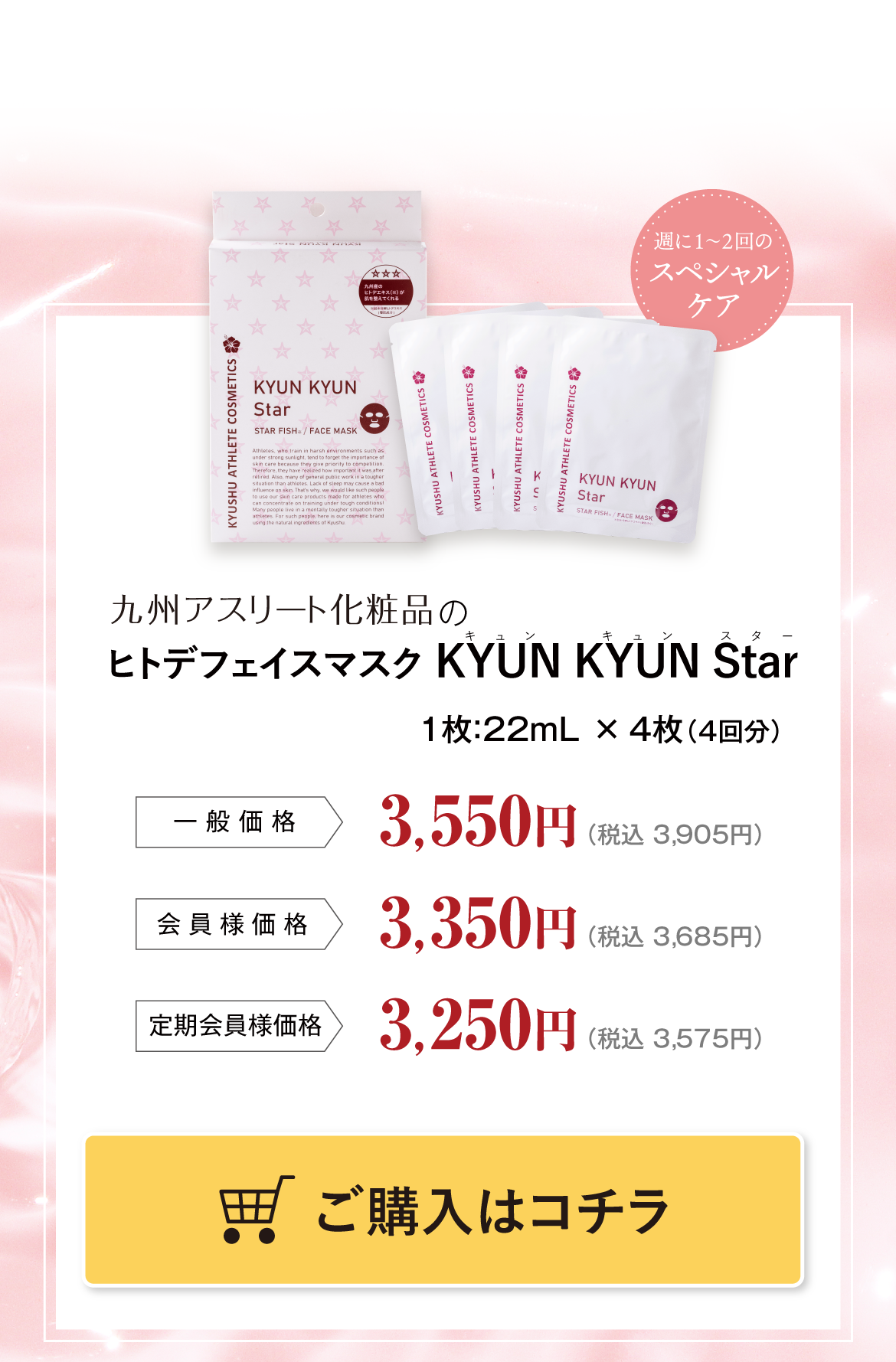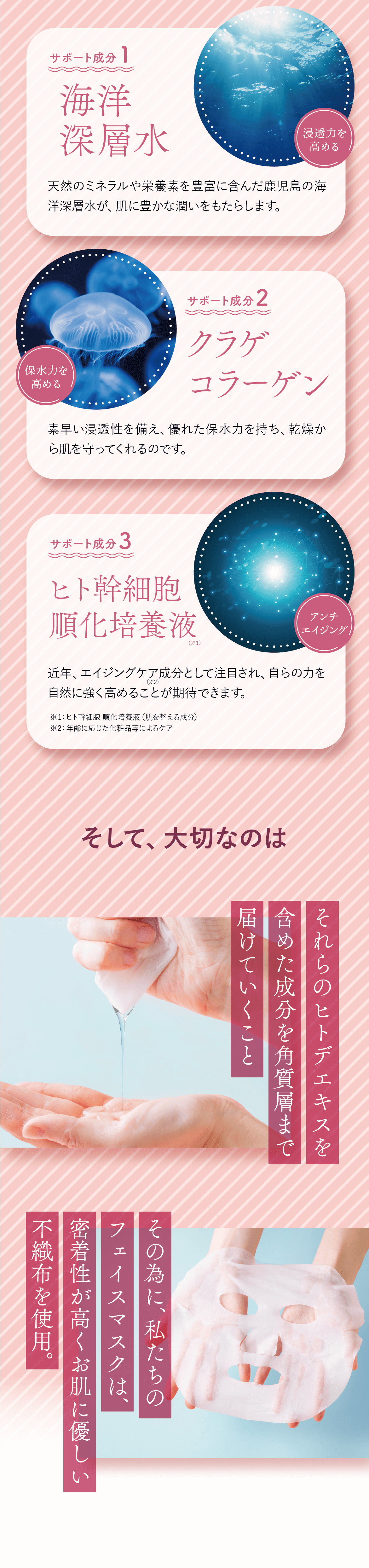 水、グリセリン、BG、DPG、グリセレス-26、ペンチレングリコール、グリチルリチン酸2K、ヒト幹細胞順化培養液、アルブチン、トリ(カプリル酸/カプリン酸)グリセリル、水添レシチン、プラセンタエキス、ヒアルロン酸Na、ポリソルベート80、加水分解ヒトデエキス、ヒバマタエキス、クビレヅタエキス、ハイビスカス花エキス、アロエベラ葉エキス、加水分解紅藻エキス、水溶性コラーゲン、キサンタンガム、カルボマー、フェノキシエタノール、カプリリルグリコール、1,2-ヘキサンジオール、水酸化K、クエン酸、クエン酸Na、酢酸トコフェロール、安息香酸Na