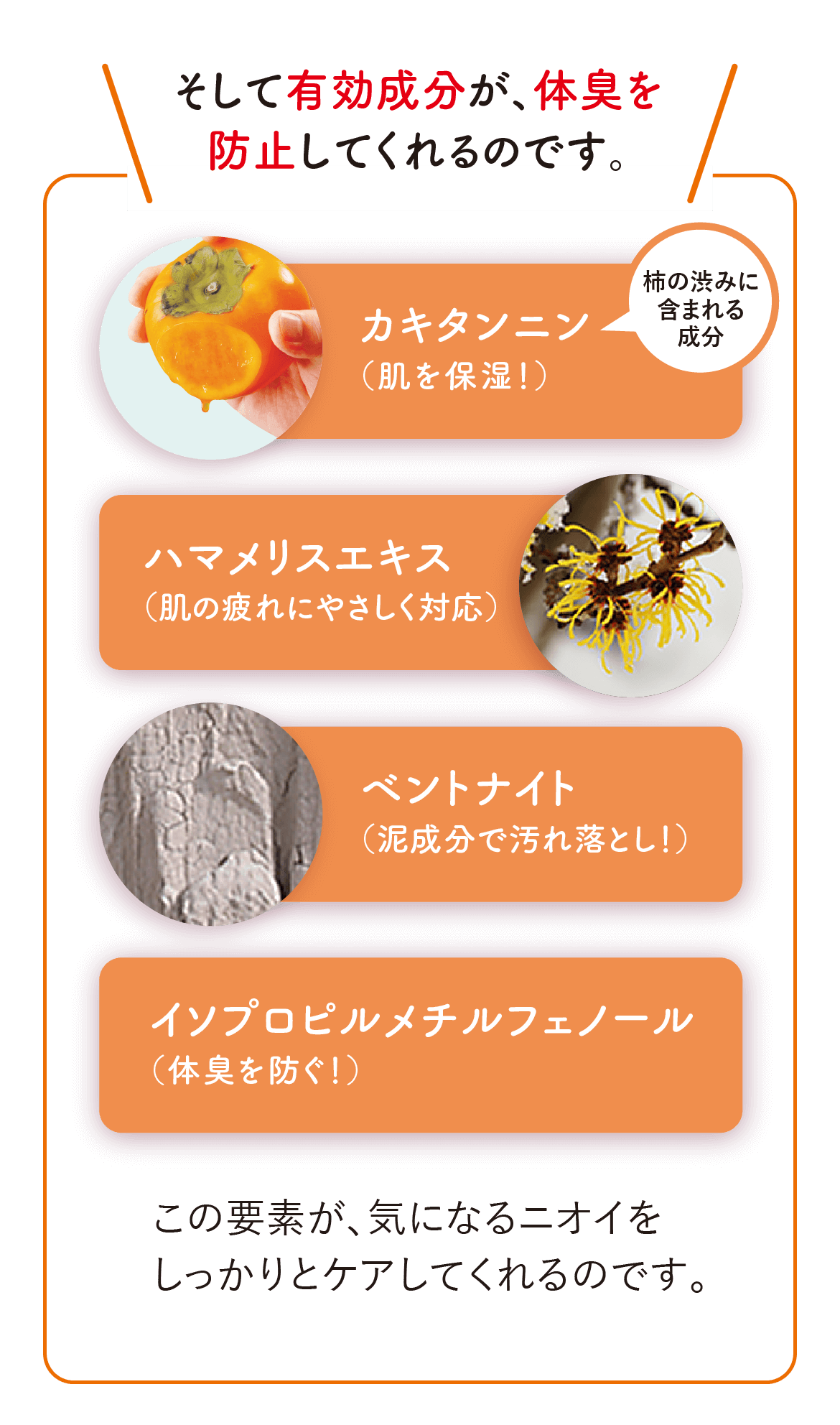 イソプロピルメチルフェノール※、石けん用素地、カキタンニン、柿葉末、濃グリセリン、ベントナイト、ファンゴ、ハマメリスエキス、グリチルリチン酸2K、オウゴンエキス、トレハロース、アロエエキス−2、ホホバ油、ユーカリ油、BG、酸化Ti、硫酸Zn、黄酸化Fe、クエン酸、クエン酸Na、β−シクロデキストリン、グリシン、紅茶エキス、黒砂糖、ベンガラ、ヒドロキシエタンジホスホン酸4Na液、褐藻エキス−2、水溶性コラーゲン液−4、ローヤルゼリーエキス、ショウブ根エキス、サボンソウエキス、コメ発酵液、フェノキシエタノール ※は「有効成分」無表示は「その他の成分」