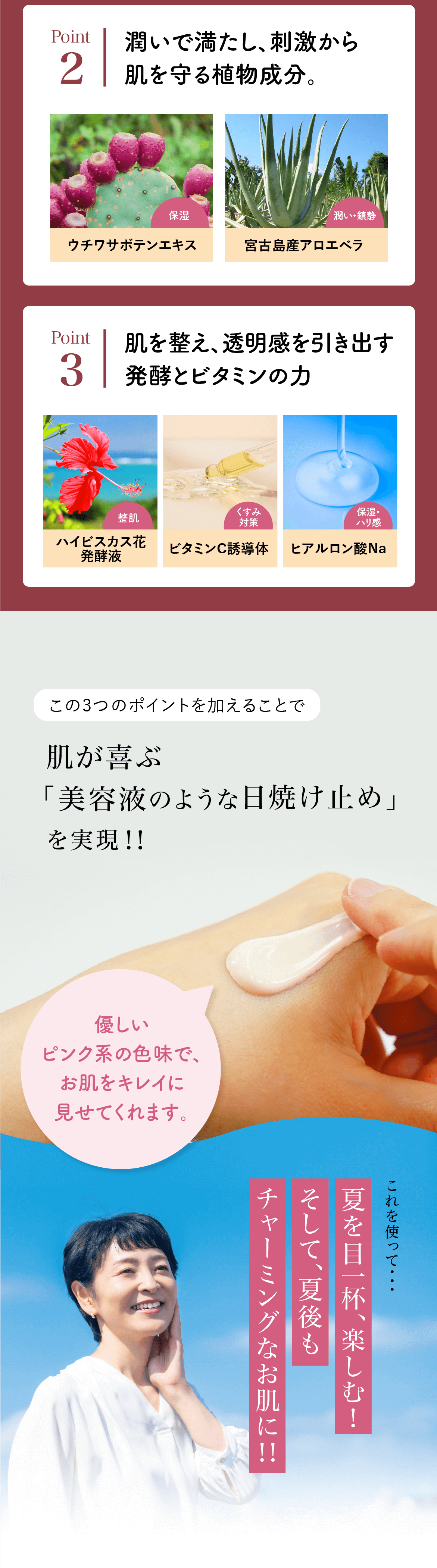 水、酸化亜鉛、トリ(カプリル酸/カプリン酸)グリセリル、トリエチルヘキサノイン、酸化チタン、BG、DPG、トリエトキシカプリリルシラン、ペンチレングリコール、スクワラン、加水分解ヒトデエキス、乳酸桿菌/ハイビスカス花発酵液、オプンチアフィクスインジカ茎エキス、グリセリン、アロエベラ葉エキス、ヒバマタエキス、アスコルビルグルコシド、グリセレス-26、ヒアルロン酸Na、ラウリン酸ポリグリセリル-10、ダイマージリノール酸(フィトステリル/イソステアリル/セチル/ステアリル/ベヘニル)、セスキイソステアリン酸ソルビタン、トリオレイン酸ポリグリセリル-10、(アクリル酸ヒドロキシエチル/アクリロイルジメチルタウリンNa)コポリマー、含水シリカ、キサンタンガム、ポリヒドロキシステアリン酸、ポリソルベート60、ハイドロゲンジメチコン、シリカ、フェノキシエタノール、トコフェロール、合成金雲母、水酸化Al、酸化鉄