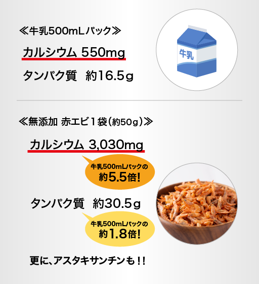 そんな「赤えび」には、タンパク質とカルシウム共に豊富に含まれています。