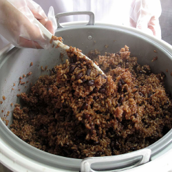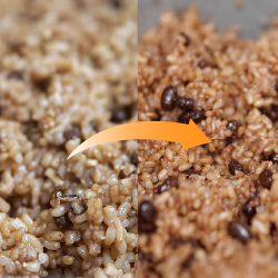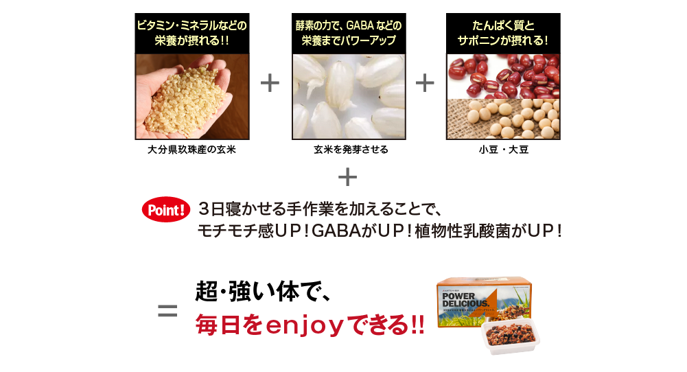 まず、水がキレイな大分玖珠のお米を使うのは当然。そして、玄米を ぬるま湯で発芽させ、栄養素を更に強化。それに、小豆と大豆をブレンドし、タンパク質までを摂れるように。
